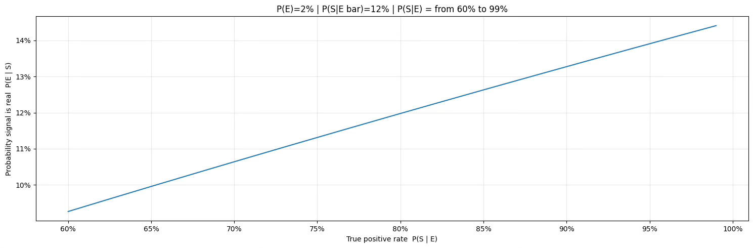 The event frequency is fixed at 2%, and the false positive rate remains at 12%, exactly as in the previous sections. Only P(S∣E) is allowed to change.