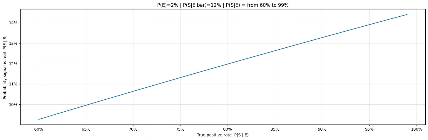 The improvement is real, but modest. Even large increases in detection accuracy translate into relatively small gains in the probability that a signal is actually correct.