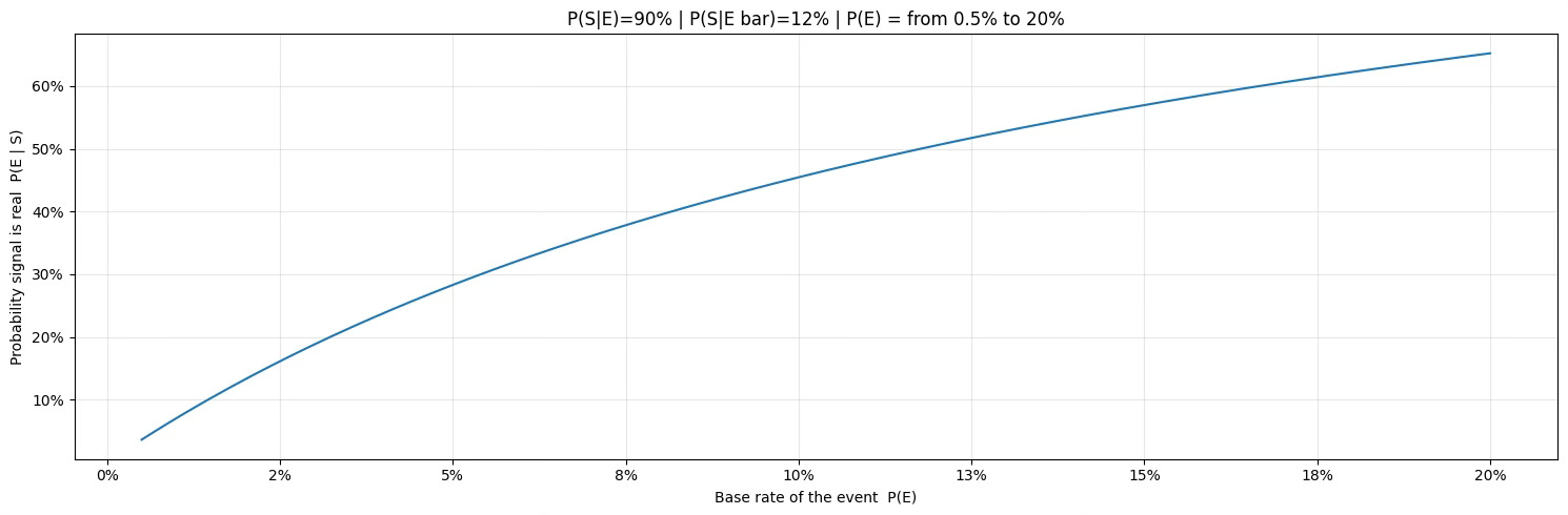 When the event is extremely rare, even a well-behaved model produces signals that are mostly noise. As the event becomes more frequent, the same model suddenly appears far more reliable.