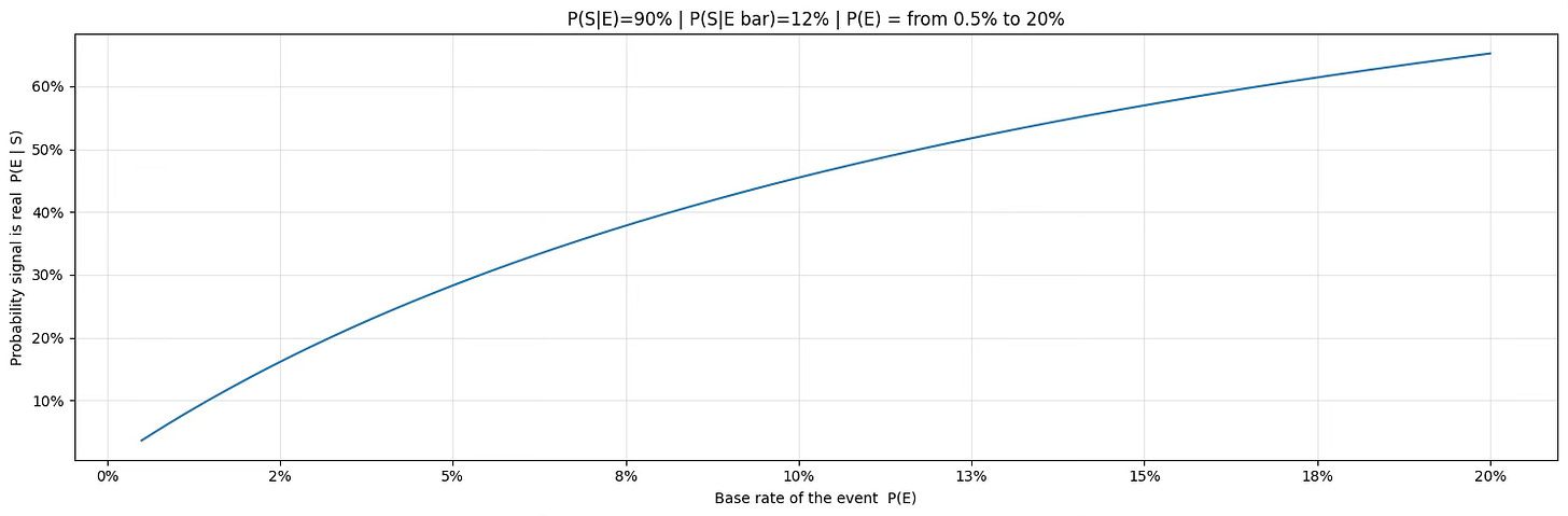 In this second experiment, we keep the model behavior fixed and vary only the frequency of the event itself. The detection accuracy remains at 90%, and the false positive rate at 12%, exactly as before. Only the base rate P(E) changed.