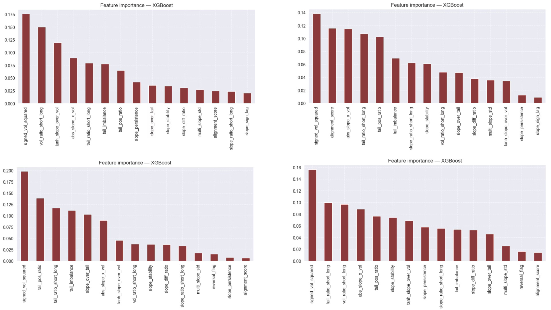 Across all four FX futures, the same group of features keeps emerging at the top of the XGBoost rankings: signed_vol_squared, vol_ratio_short_long, and tail_ratio_short_long.