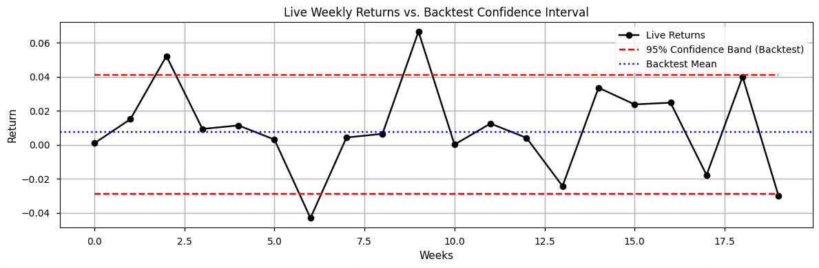 You can compute a confidence interval (e.g., 95%) around your backtest or early live results, then compare the recent returns.