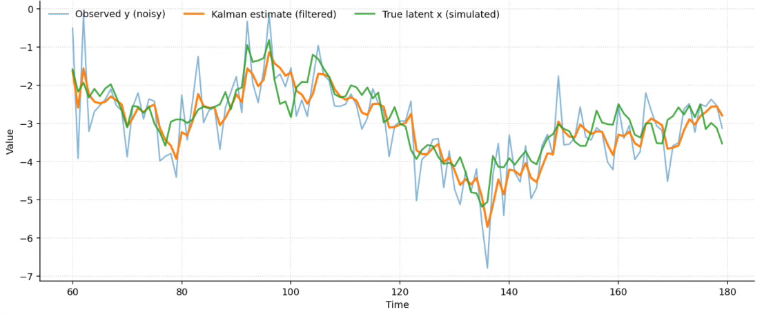 The “latent state” is not a mystical fair value. It is simply the signal you choose to model: a smoother price level, a latent volatility, a stable trend component, a cleaner spread.