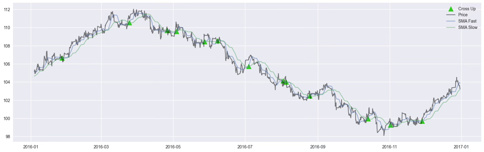 We generated a buy signal whenever a short-term moving average (20-period SMA) crossed above a longer-term one (60-period SMA). This is a classic trend-following setup used to define potential entry points.Label the trades using the Triple-Barrier Method